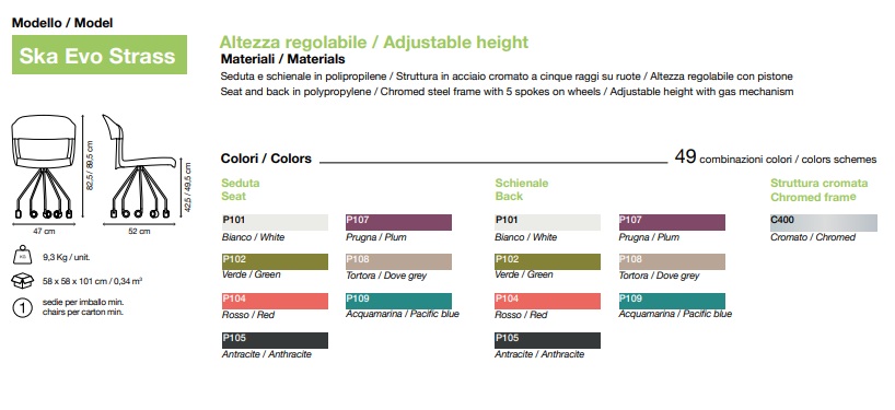 Greeni Ska Evo Strass kontoritool on värvikas, tugev ja kerge meistriteos. Selle graatsiline ning tagasihoidlik vorm toob esile atraktiivsed jooned ja šiki minimalistliku ilme, milles peegeldub Itaalia disaini elegants. Polüpropüleenist iste ja seljatugi on saadaval seitsmes erinevas värvitoonis, pakkudes rohkelt võimalusi isikupärasteks värvikombinatsioonideks. Toolil on kroomitud terasraam viie rattaga, mis tagab sujuva liikuvuse. Istumiskõrgus on reguleeritav gaasimehhanismi abil, et pakkuda maksimaalset mugavust ja ergonoomikat.