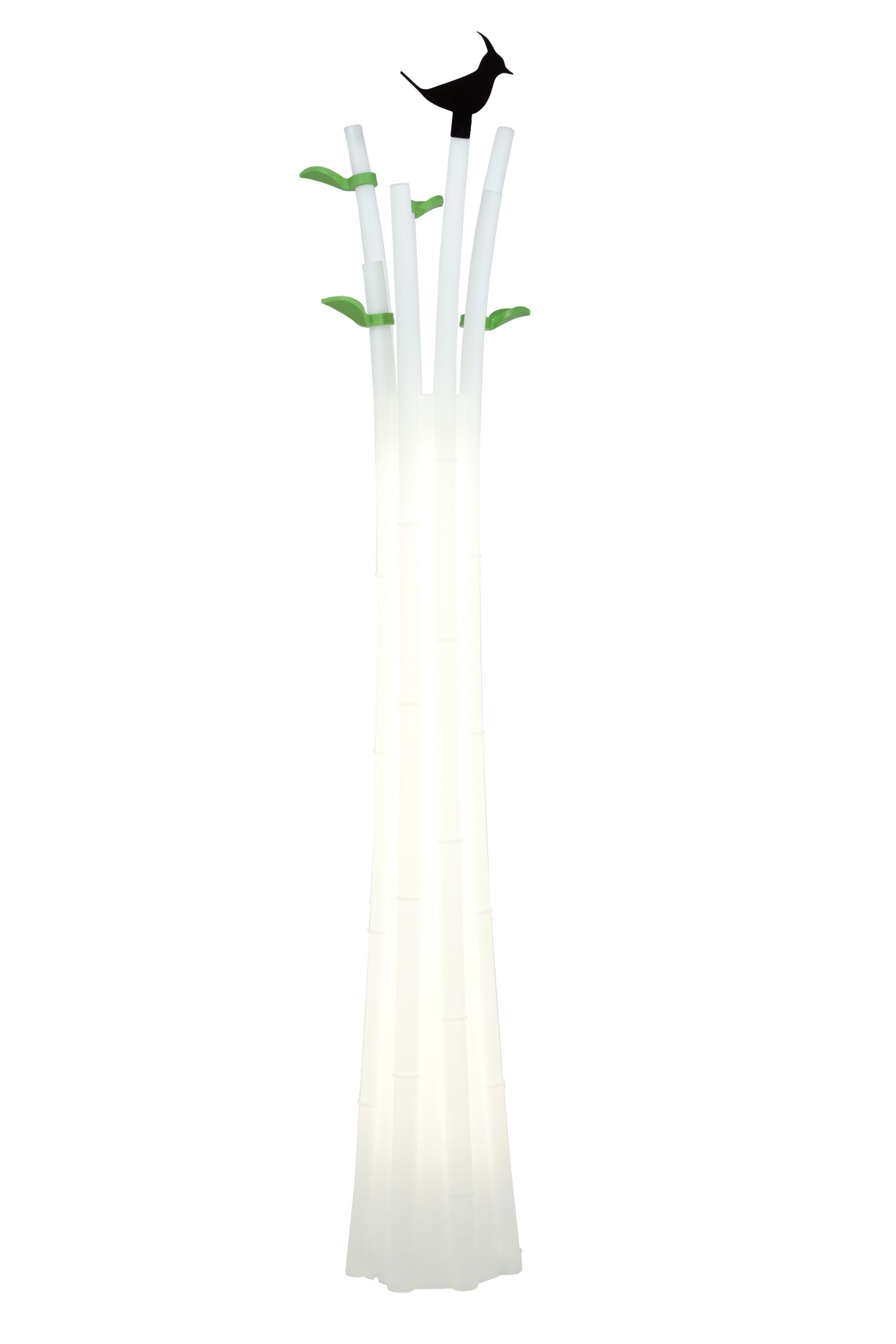 Valgustatud riidenagi. Traditsiooniline valgustus kaabli ja pistikupesaga või LED-valgustusega. Soovitatav lambipirn: White, E27, Spiralised 23W, 1380 lm, Ø 55, H113. Mõned esemed leiavad tee nii südamesse kui ka koju. Need on äratuntavad tuhandete seast, püsides kindlalt muutuvate trendide ja moevoogude keskel ning kujunedes tõelisteks tööstusdisaini klassikuteks. Üks neist on Bamboo – ese, milles funktsionaalsus kohtub mängulise irooniaga. Lehtede ja linnu motiiv loovad kahekordse identiteedi: see võib olla nii elegantne saalipuu kui ka isikupärane „totemlamp“. Valmistatud värvilisest ja opaalhallist polüetüleenist, kannab see endas loodusest inspireeritud vormi ja meeleolu. Kaasas 4 lehekest, mida on võimalik juurde tellida. Linnu kuju juurde tellitav.