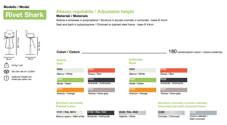 Rivet Sharki voolujooneline ja ergonoomiline kuju tagab suurepärase istumismugavuse ning tänu laiale värvivalikule on see erakordselt mitmekülgne. Rivet Shark on pöörlev ja kõrguselt reguleeritav tänu gaasikolviga mehhanismile, mille juhtkang asub istme all. Keskne jalg koos jalatoega tagab stabiilsuse ja kasutusmugavuse. Iste koos integreeritud käetugedega on valmistatud järgmise põlvkonna klaaskiuga tugevdatud termoplastilisest materjalist – kerge, vastupidav ja hõlpsasti hooldatav vee ning õrna seebiga. See mudel sobib suurepäraselt kodusesse interjööri, köögisaarte juurde või suupistealadesse, kuid on sama hästi kasutatav ka avalikes ruumides, nagu pubid, ööklubid, baarid ja kohvikud.