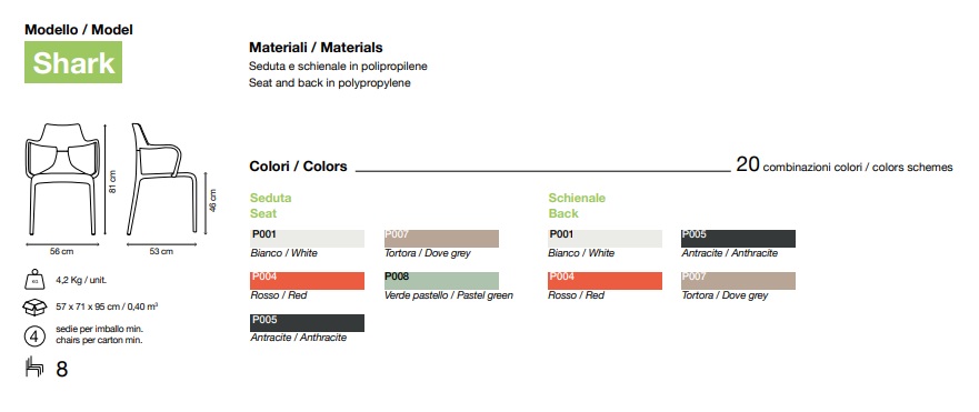Virnastatav Shark tool on värvikas, tugev ja kerge – ideaalne kooslus nii igapäevaseks kui ka intensiivsemaks kasutamiseks. See on loodud pakkuma läbimõeldud mugavust, säilitades samal ajal suure vastupidavuse. Tooli muudab eriliseks selle värvikombinatsioonide paindlikkus: polüpropüleenist istme ja seljatoe neli värvitooni võimaldavad kokku 20 erinevat kombinatsiooni. Shark sobitub igasse keskkonda – iga ainulaadne värvilahendus annab sellele uue ilme ja iseloomu.